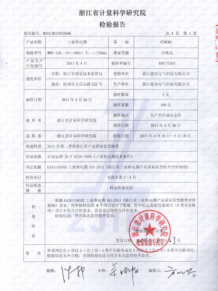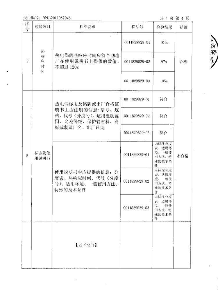 2011年第2季度檢測報告(工業(yè)熱電偶)
